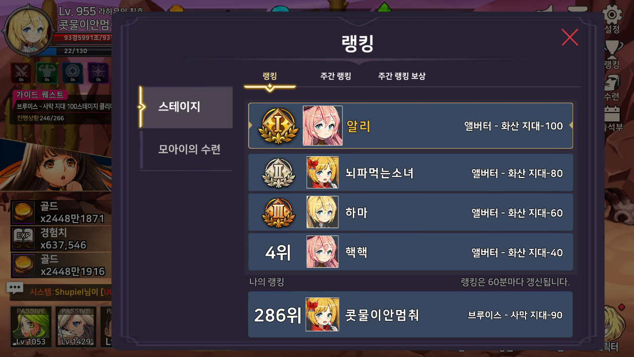 *소녀검사 키우기 한달 반 리뷰 현재 스테이지 랭킹 286위, 수련 랭킹 276위